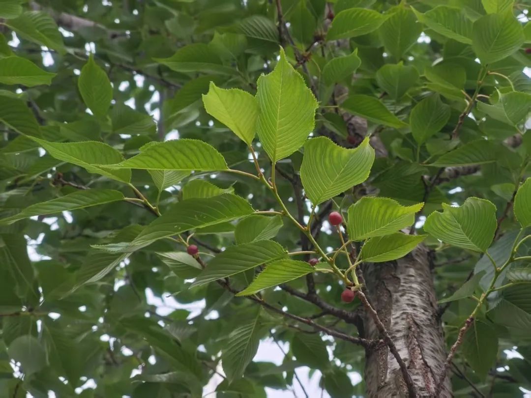4月29日下午,记者在十里江湾公园看到,部分树上挂满红色小果,绿叶掩映下格外醒目。果实外观类似樱桃,但比市售樱桃更小巧。市售樱桃晶莹剔透,而眼前的果子色泽偏暗,更像是未成熟的“幼年版”。一位市民驻足观察后说:“去年没见结果,今年结得密集显眼,但估计不能吃。”