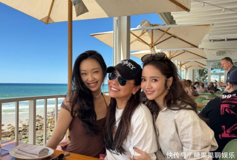 看照片中的背景,三人是在海边的一个餐厅,地点应该是在国外,她们的身后有许多外国人。