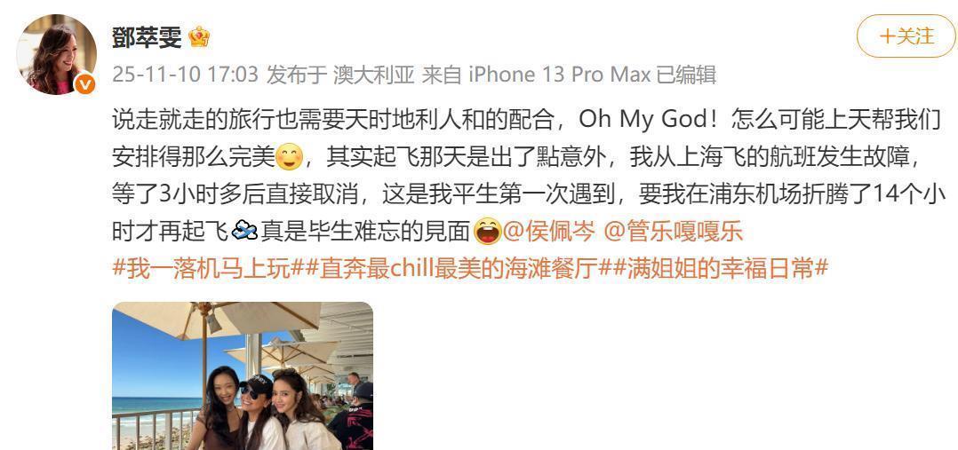 11月10号,邓女士在自己的社交账号上发布了一张照片,是她跟管乐还有侯佩岑的合照。